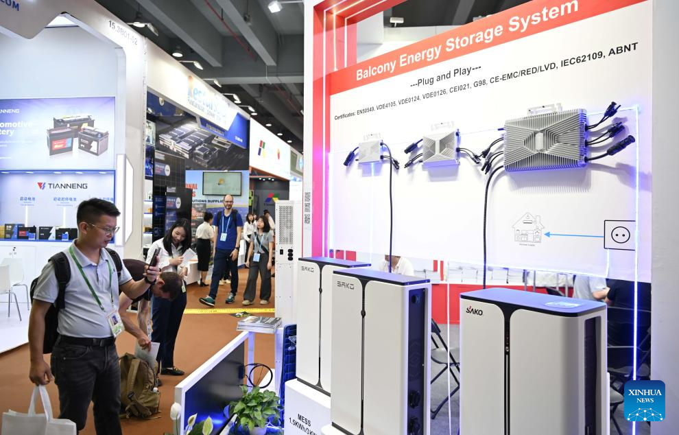 Energy storage exhibits are pictured during the 135th session of the China Import and Export Fair in Guangzhou, south China's Guangdong Province, April 15, 2024. Electric vehicles, solar batteries and lithium-ion batteries, categorized as China's tech-intensive and green "new three," reported a combined export value of 1.06 trillion yuan (150 billion dollars) in 2023, jumping 29.9 percent year on year. Lots of exhibitors in the related industries showcase various products in the ongoing 135th session of the China Import and Export Fair, also known as the Canton Fair, in Guangzhou. (Xinhua/Deng Hua)