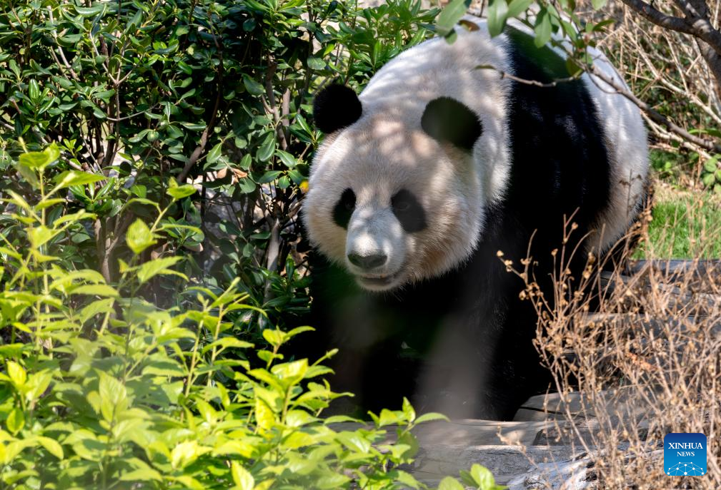 Giant panda Rongyao roams at an outside area at the Panda World in Fuzhou, southeast China's Fujian Province on Jan. 17, 2026. Five giant pandas, arriving from Chengdu, met the public at the reopened Fuzhou Panda World on Saturday, following a 20-day adaptation period. (Xinhua/Wei Peiquan)