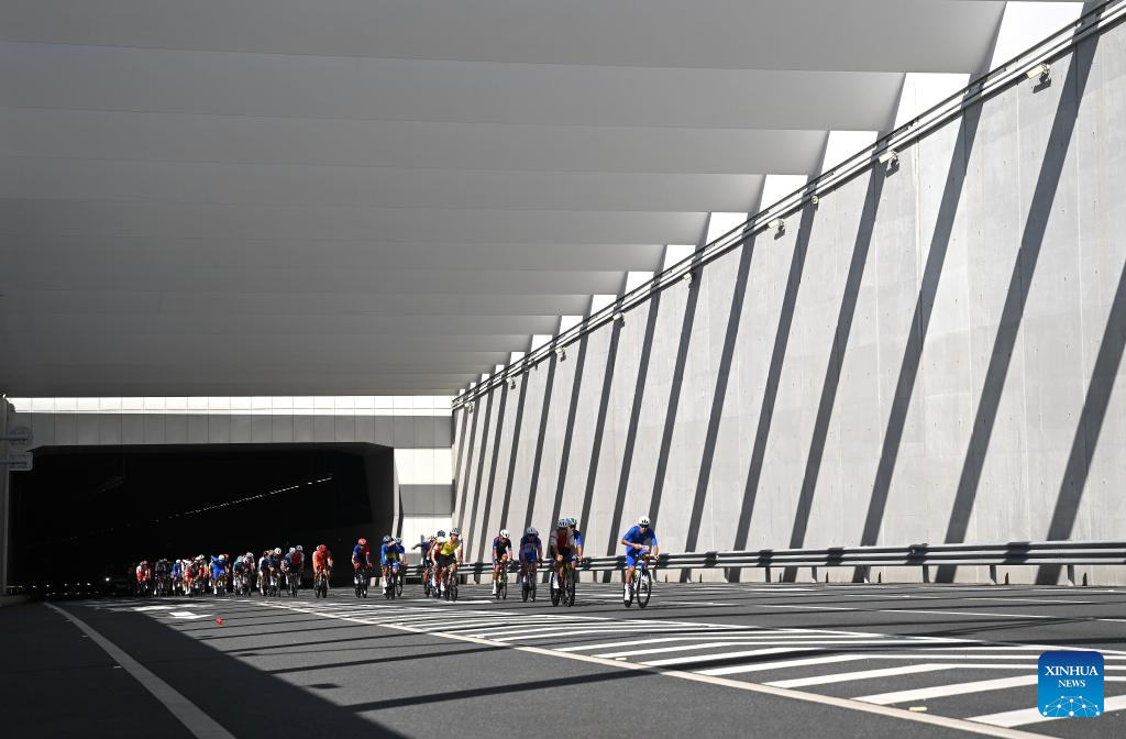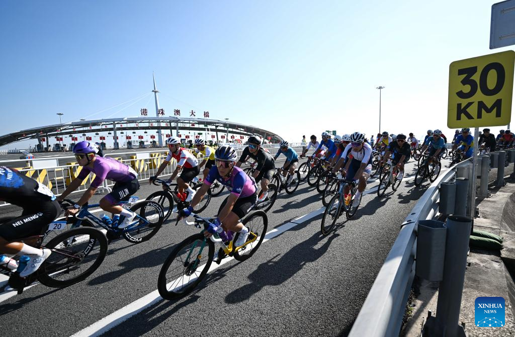 Cyclists compete across the Hong Kong-Zhuhai-Macao Bridge during the men's road race of cycling road at China's 15th National Games in Hong Kong, south China, Nov. 8, 2025. (Xinhua/Zhu Wei)