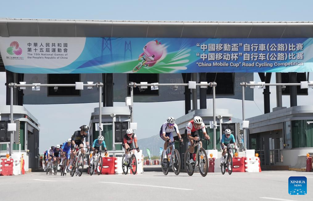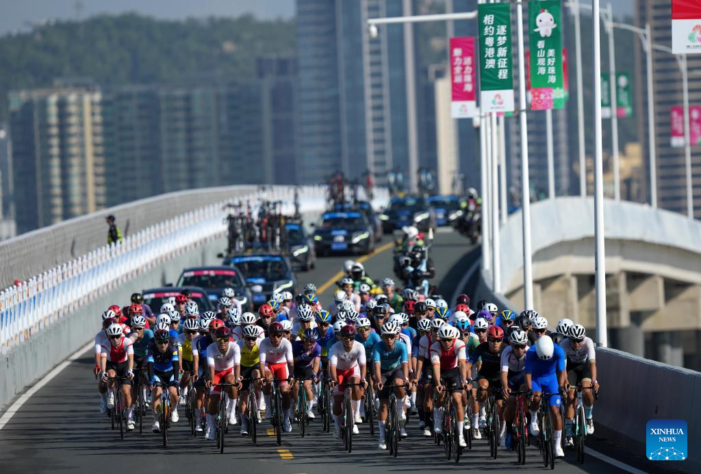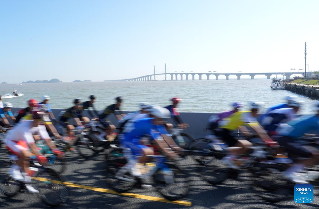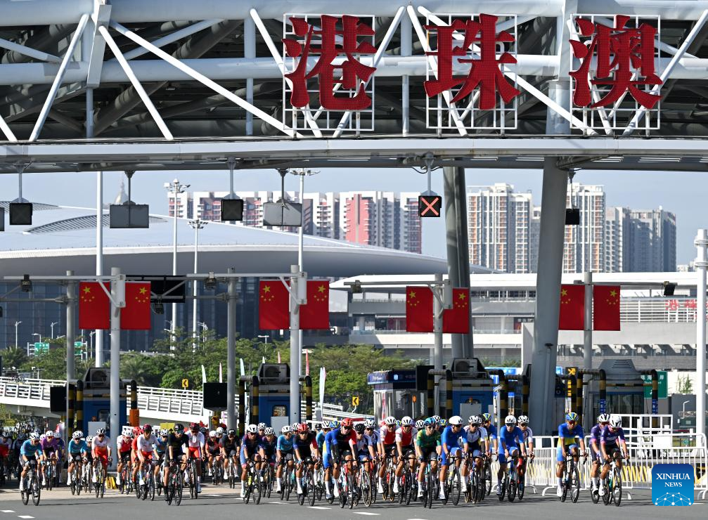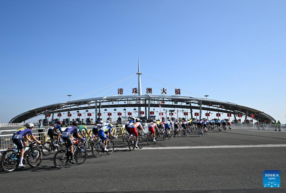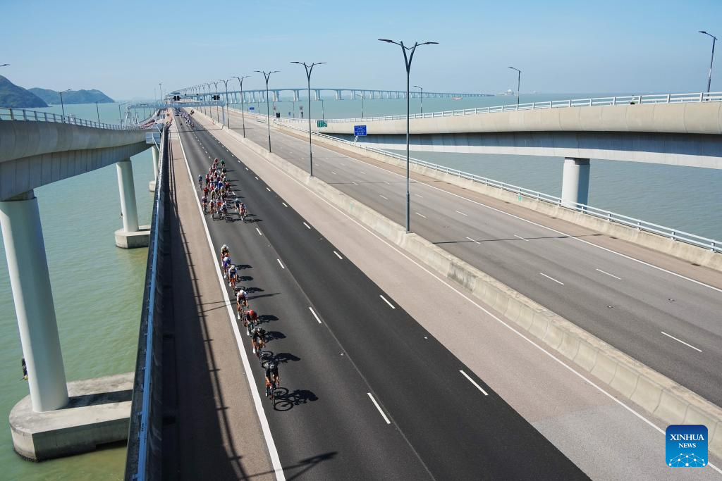 Cyclists compete across the Hong Kong-Zhuhai-Macao Bridge during the men's road race of cycling road at China's 15th National Games in south China's Guangdong Province, Nov. 8, 2025. (Xinhua/Lian Zhen)