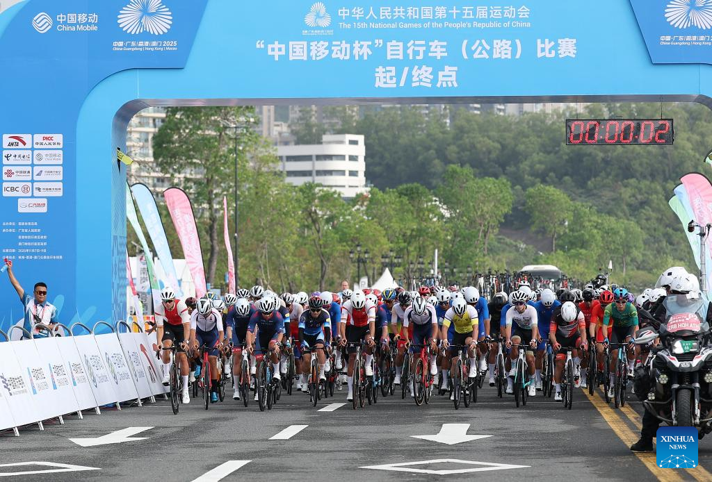 Athletes compete during the men's road race of cycling road at China's 15th National Games in south China's Guangdong Province, Nov. 8, 2025. (Xinhua/Mao siqian)