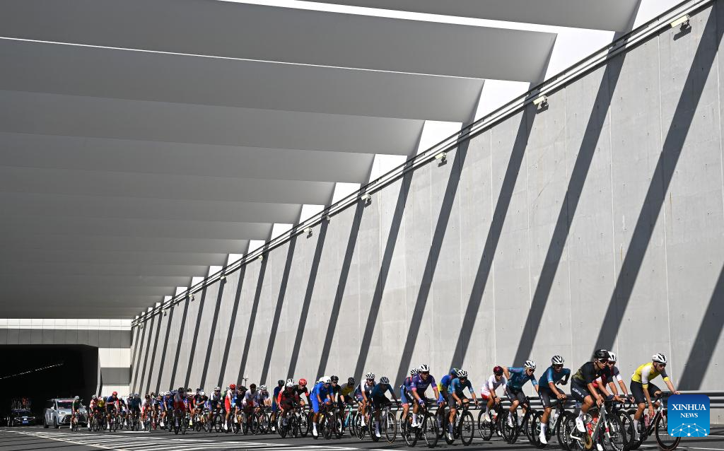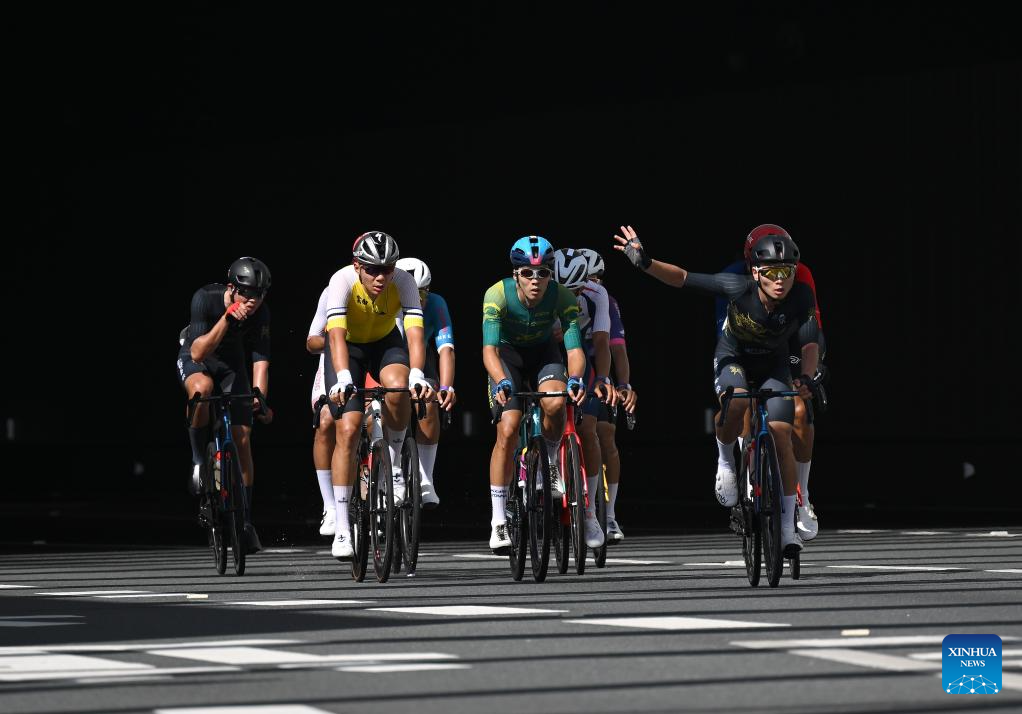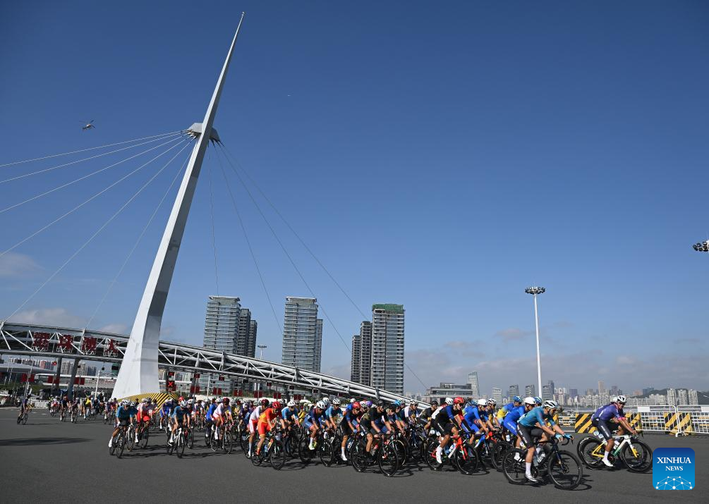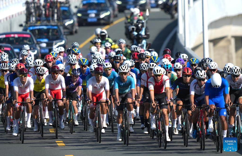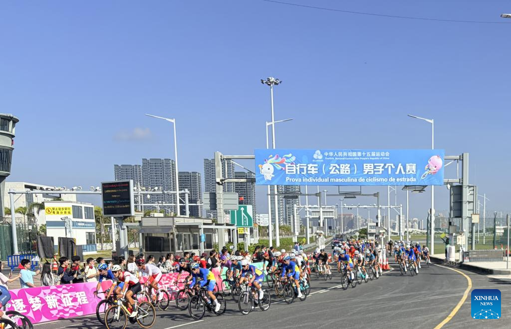 Cyclists compete during the men's road race of cycling road at China's 15th National Games in south China's Guangdong Province, Nov. 8, 2025. (Xinhua/Deng Hua)