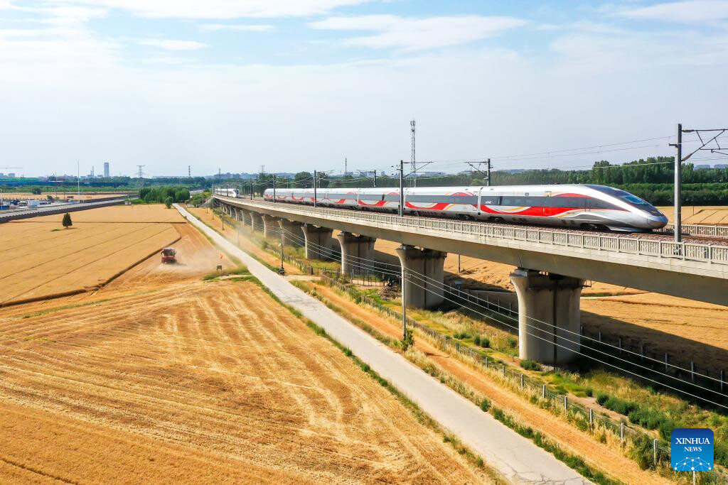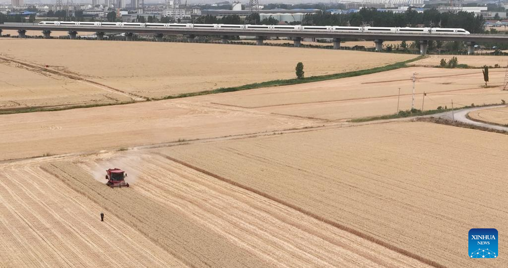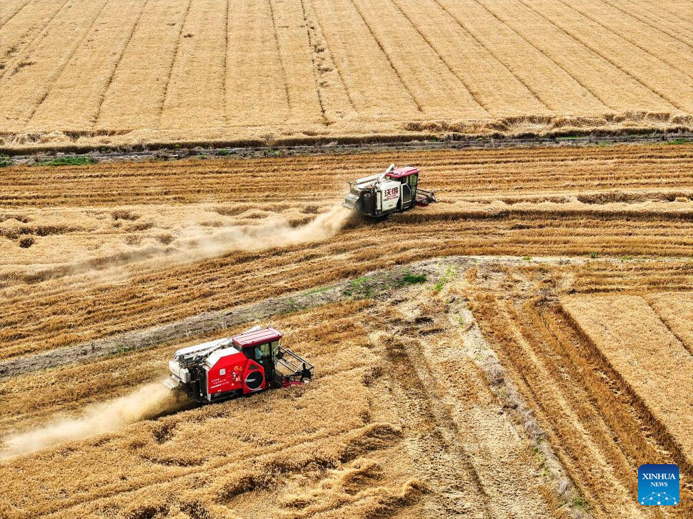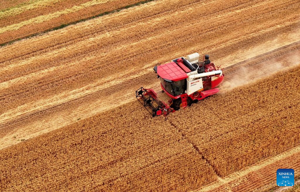 A drone photo shows harvesters reaping wheat in the fields in Pantang Village of Lizhuang Town, Shangqiu City, central China's Henan Province, June 4, 2025. (Photo by Li Heng/Xinhua)