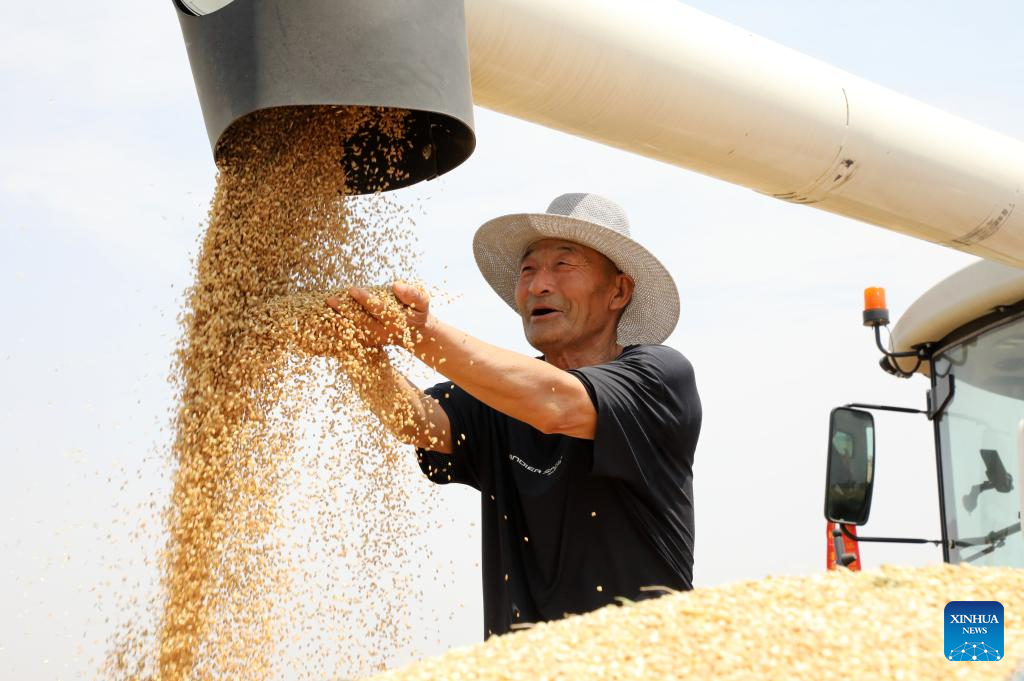 A farmer checks newly harvested wheat in Xiwangwen Village of Boxing County, Binzhou City, east China's Shandong Province, June 5, 2025. (Photo by Chen Bin/Xinhua)