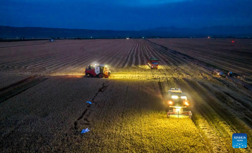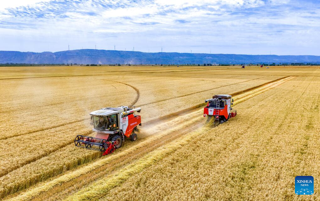 This photo shows harvesters reaping wheat in the fields in Donglu Township of Ruicheng County of Yuncheng City, north China's Shanxi Province, June 4, 2025. (Photo by Xue Jun/Xinhua)