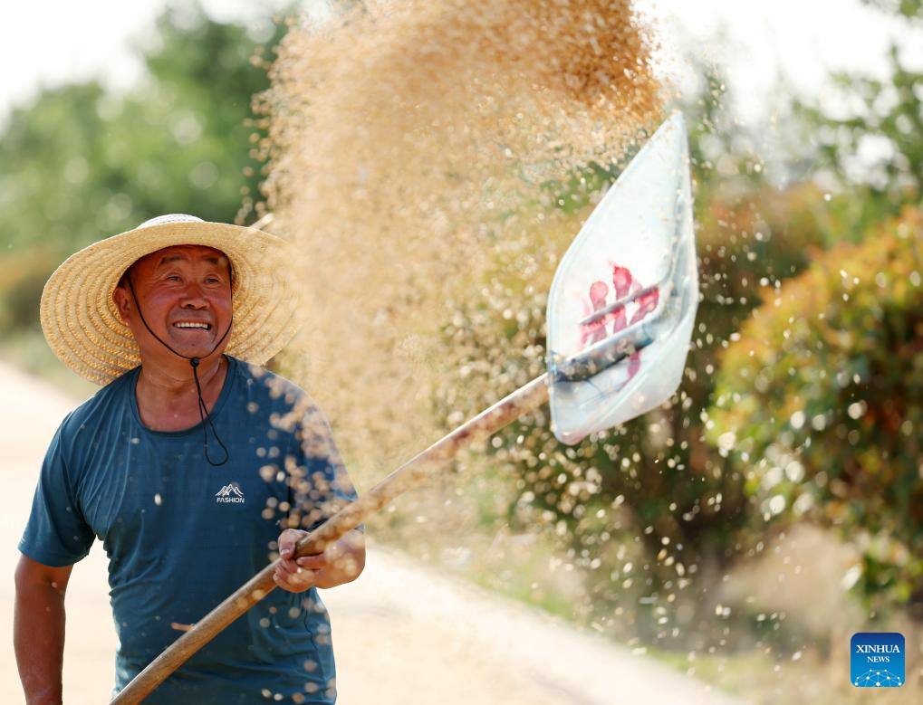 A farmer airs newly harvested wheat in Tancheng County of Linyi City, east China's Shandong Province, June 4, 2025. (Photo by Zhang Chunlei/Xinhua)