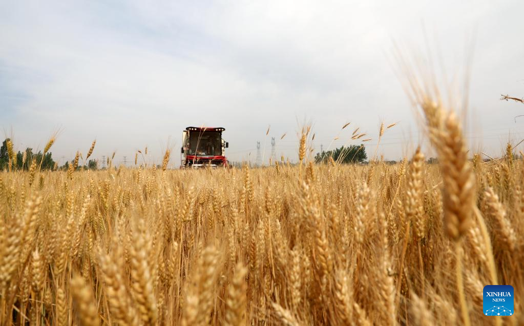 This photo shows a harvester reaping wheat in the fields in Qinhuangtai Township of Binzhou City, east China's Shandong Province, June 5, 2025. (Photo by Chu Baorui/Xinhua)