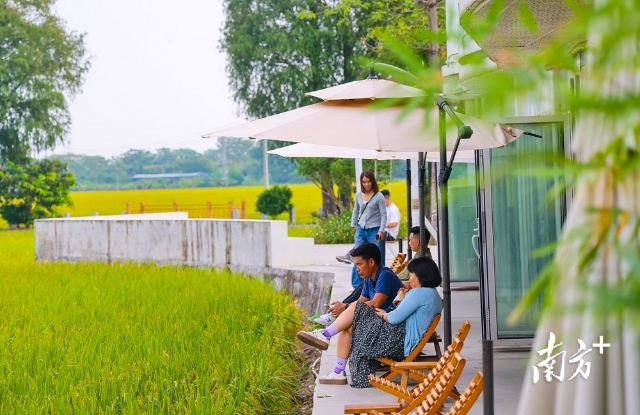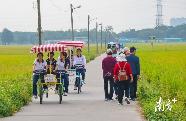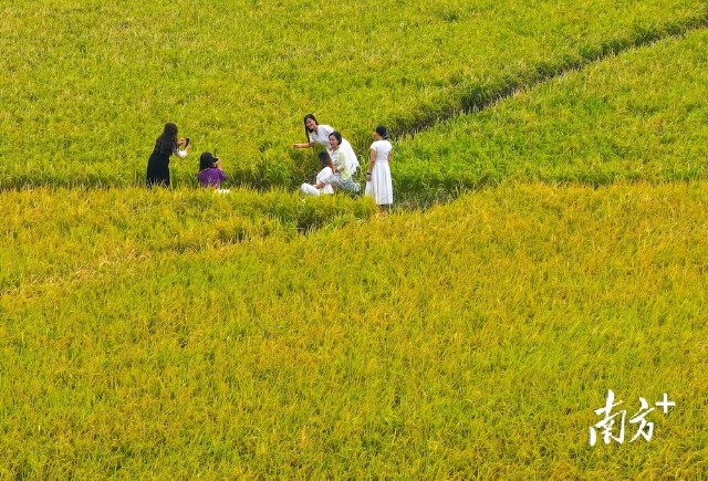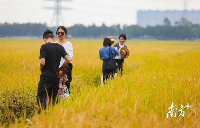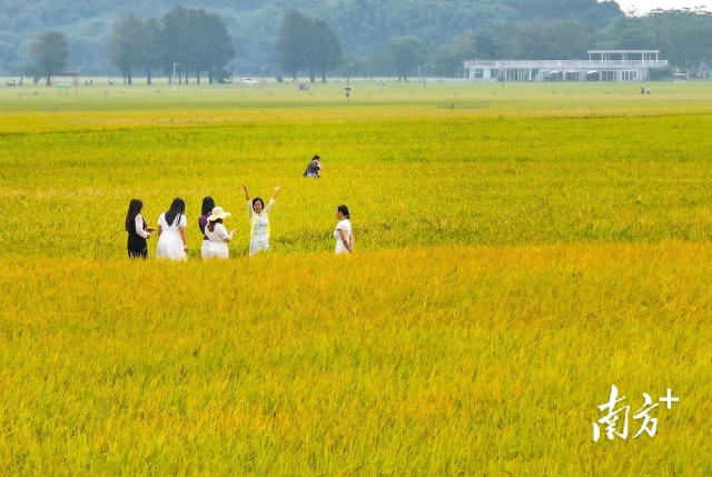 In Yakou Village, Nanlang Subdistrict of Zhongshan, rice fields have turned golden, creating stunning rural scenery at their peak viewing season.