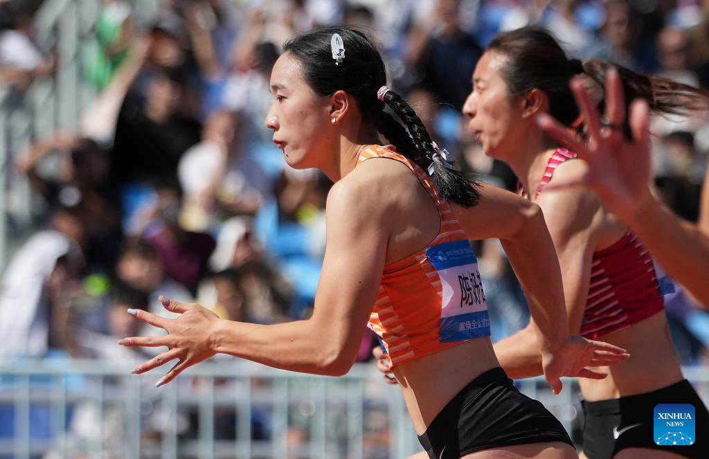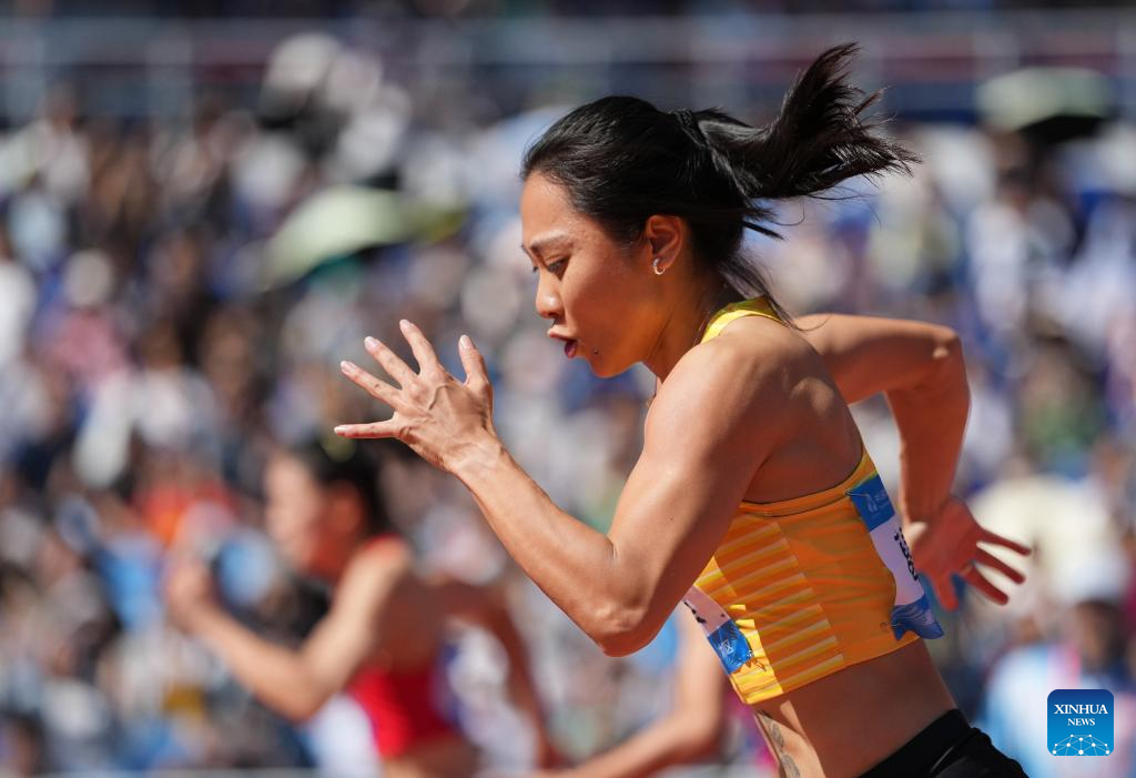 Ge Manqi of Fujian competes during the women's 100m heat of athletics at China's 15th National Games in Guangzhou, south China's Guangdong Province, Nov. 16, 2025. (Xinhua/Li Yibo)