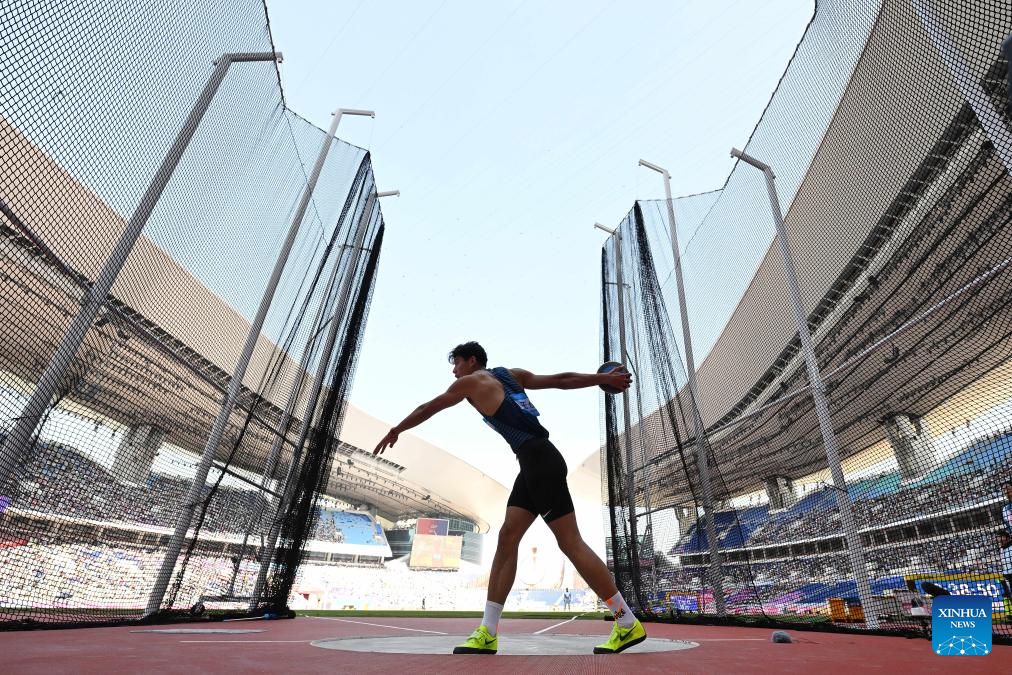 Wang Jiawei of Sichuan competes during the men's decathlon discus throw of athletics at China's 15th National Games in Guangzhou, south China's Guangdong Province, Nov. 16, 2025. (Xinhua/Jiang Han)