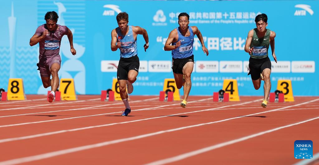Athletes compete during the men's 100m heat of athletics at China's 15th National Games in Guangzhou, south China's Guangdong Province, Nov. 16, 2025. (Xinhua/Huang Wei)