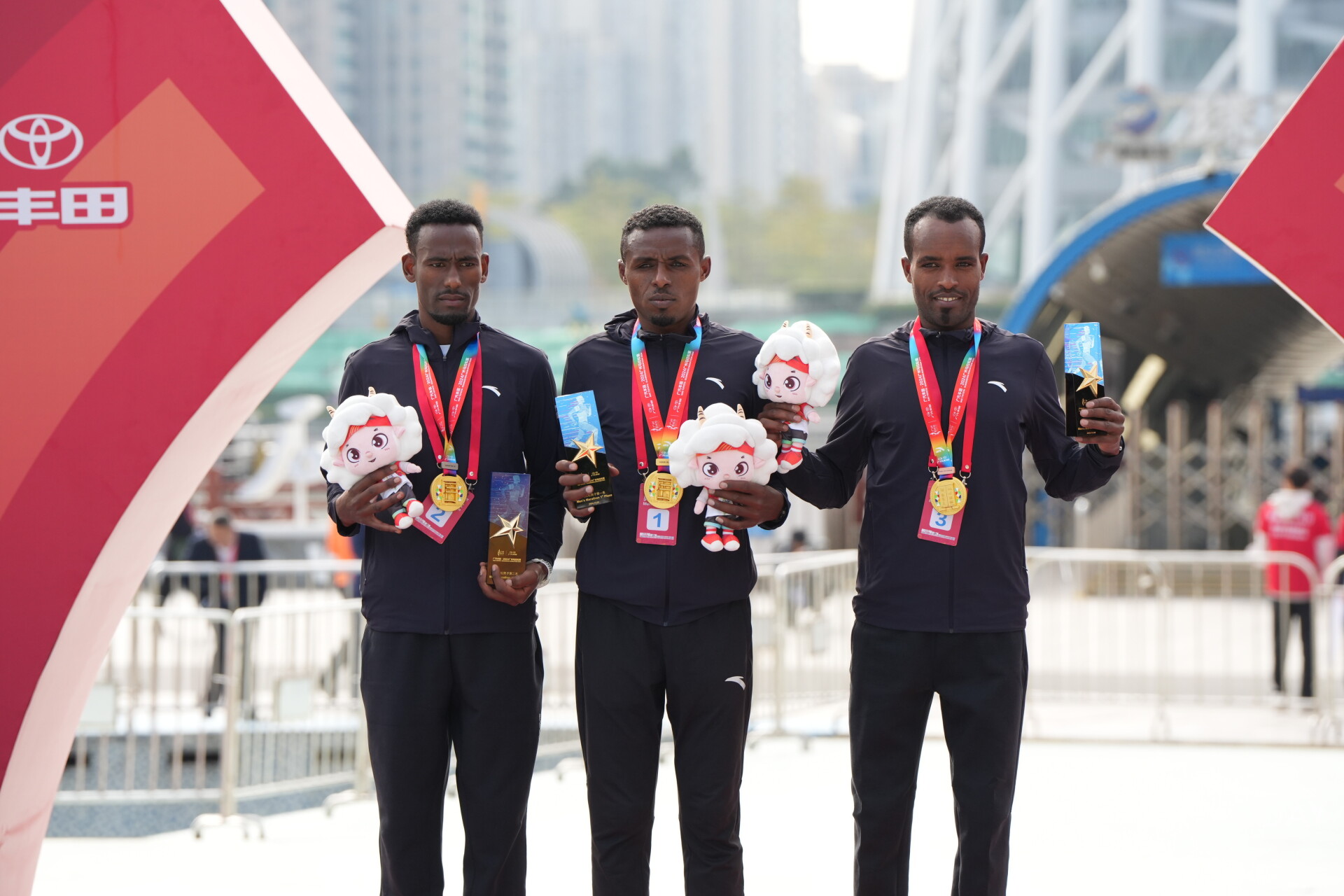 The top three male finishers pose together, with all top five male runners breaking previous marathon records.