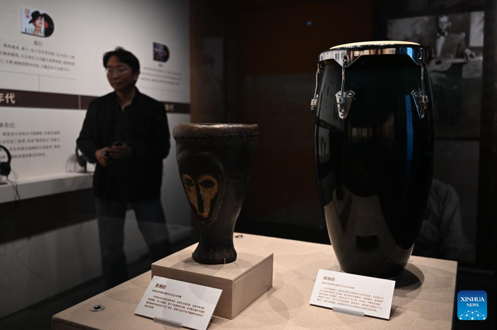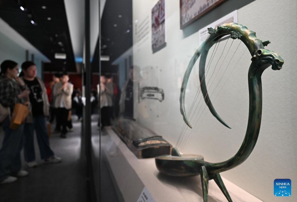 Visitors look at musical instruments during an exhibition themed on various music cultures along the ancient Silk Road at Guangzhou Maritime Museum in Guangzhou, south China's Guangdong Province, Nov. 29, 2025. The exhibition kicked off here on Saturday, showcasing 143 ancient musical instruments from countries along the Silk Road. The exhibition, which will run until April 6, 2026, presents the historical context and artistic integration of musical instruments in the cultural exchanges between the East and the West. (Xinhua/Deng Hua)