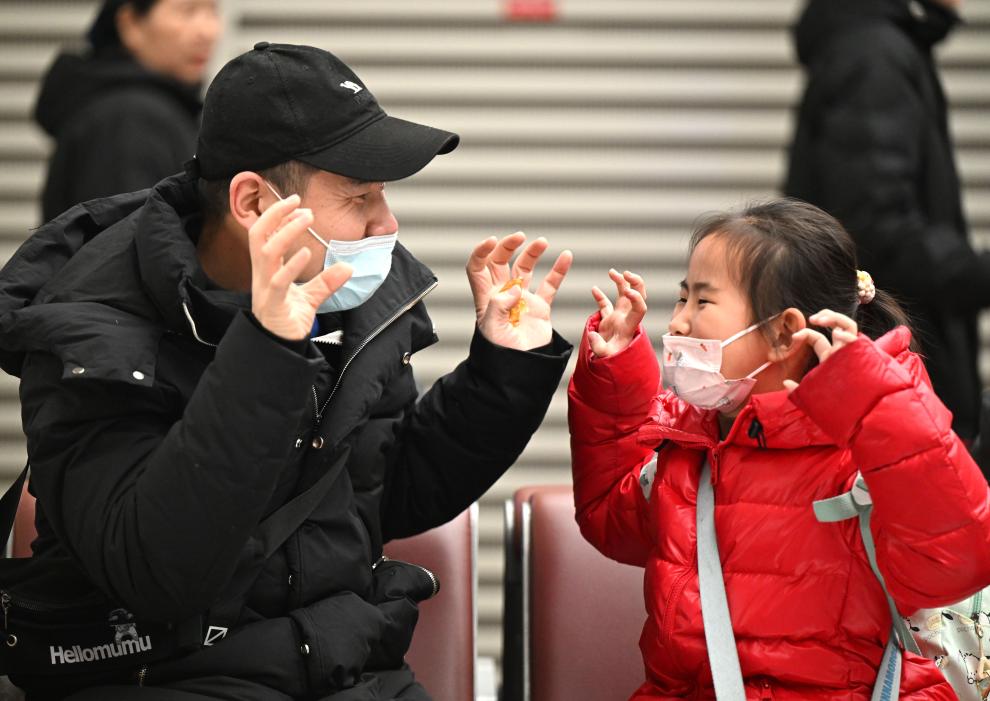 A father plays a game with his daughter at Zhengzhou East Railway Station in Zhengzhou, central China's Henan Province, Jan. 14, 2025. (Xinhua/Li Jianan)