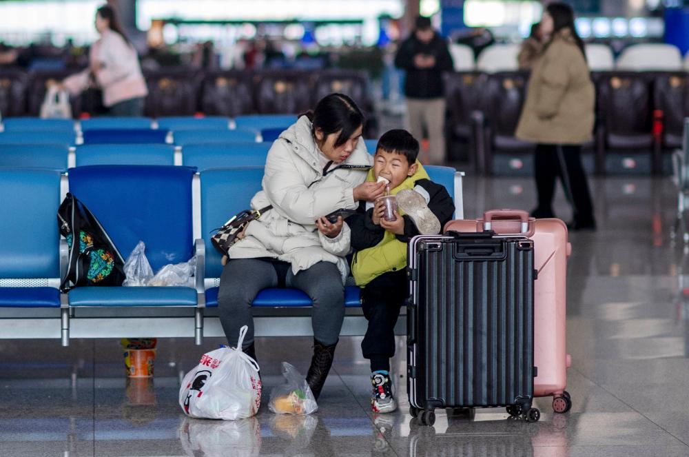 A mother and her son have breakfast at Kunming South Railway Station in Kunming, southwest China's Yunnan Province, Jan. 14, 2025. (Xinhua/Jiang Wenyao)