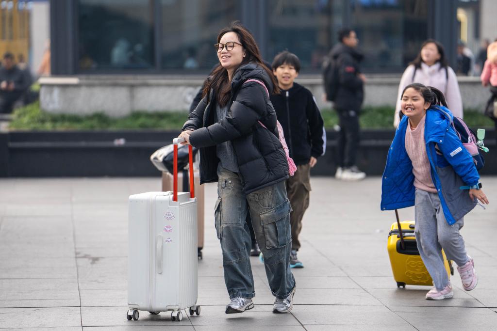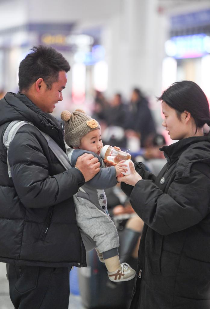 A family is pictured at Chongqing West Railway Station in southwest China's Chongqing Municipality, Jan. 14, 2025. (Xinhua/Wang Quanchao)