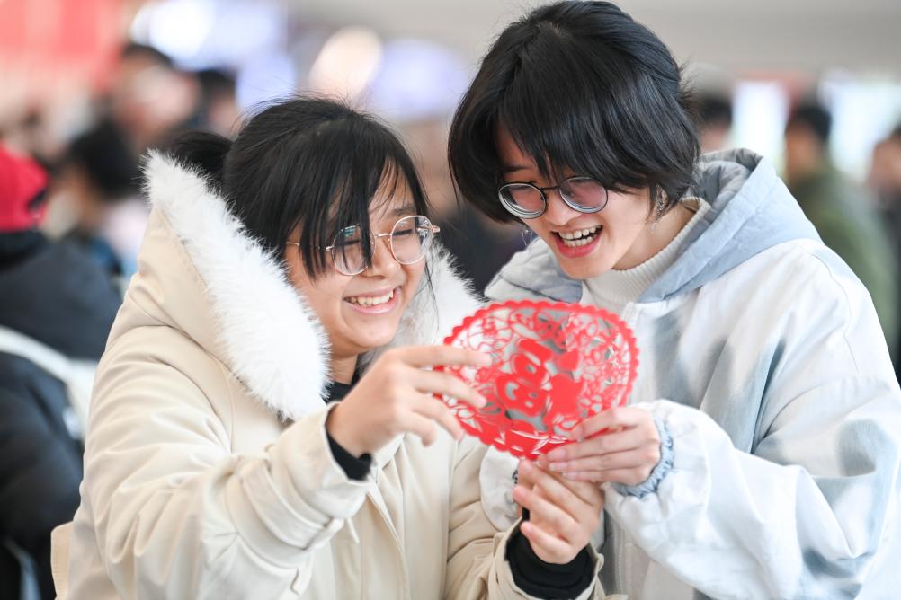 Two college students returning home try paper-cutting at Nanning East Railway Station in Nanning, south China's Guangxi Zhuang Autonomous Region, Jan. 14, 2025. (Xinhua/Cao Yiming)