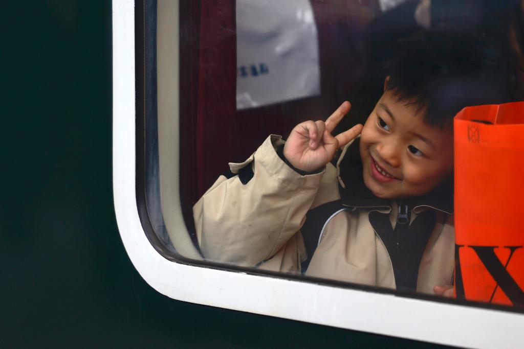 A boy gestures aboard train T258 from Urumqi, northwest China's Xinjiang Uygur Autonomous Region, to Lanzhou, northwest China's Gansu Province, Jan. 14, 2025. (Xinhua/Chen Shuo)