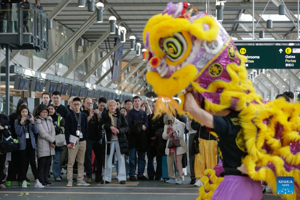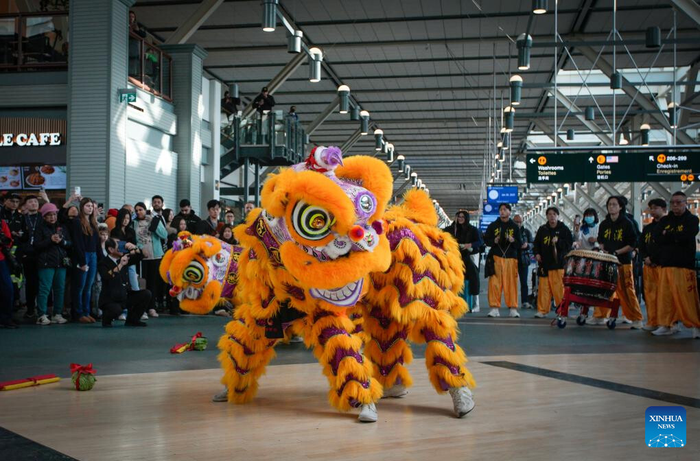People watch a lion dance performance during the Chinese New Year celebration in the departure hall of Vancouver International Airport in Richmond, British Columbia, Canada, on Jan. 29, 2025. (Photo by Liang Sen/Xinhua)