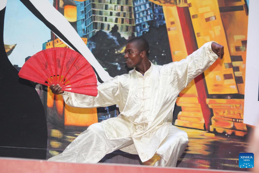 A local martial arts lover performs during a Spring Festival gala at the Chinese Cultural Center in Cotonou, Benin, Jan. 25, 2025. The 2025 "Happy Chinese New Year" celebrations kicked off here recently, which will last till Feb. 12. (Photo by Seraphin Zounyekpe/Xinhua)