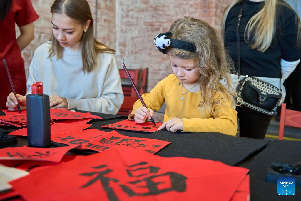 Participants try Chinese calligraphy during an event in celebration of the Chinese New Year at the Confucius Institute of Far Eastern Federal University of Russia, in Vladivostok, Russia, Jan. 29, 2025. The Confucius Institute of Far Eastern Federal University of Russia hosted a Chinese New Year cultural experience event, attracting many participants. (Photo by Guo Feizhou/Xinhua)