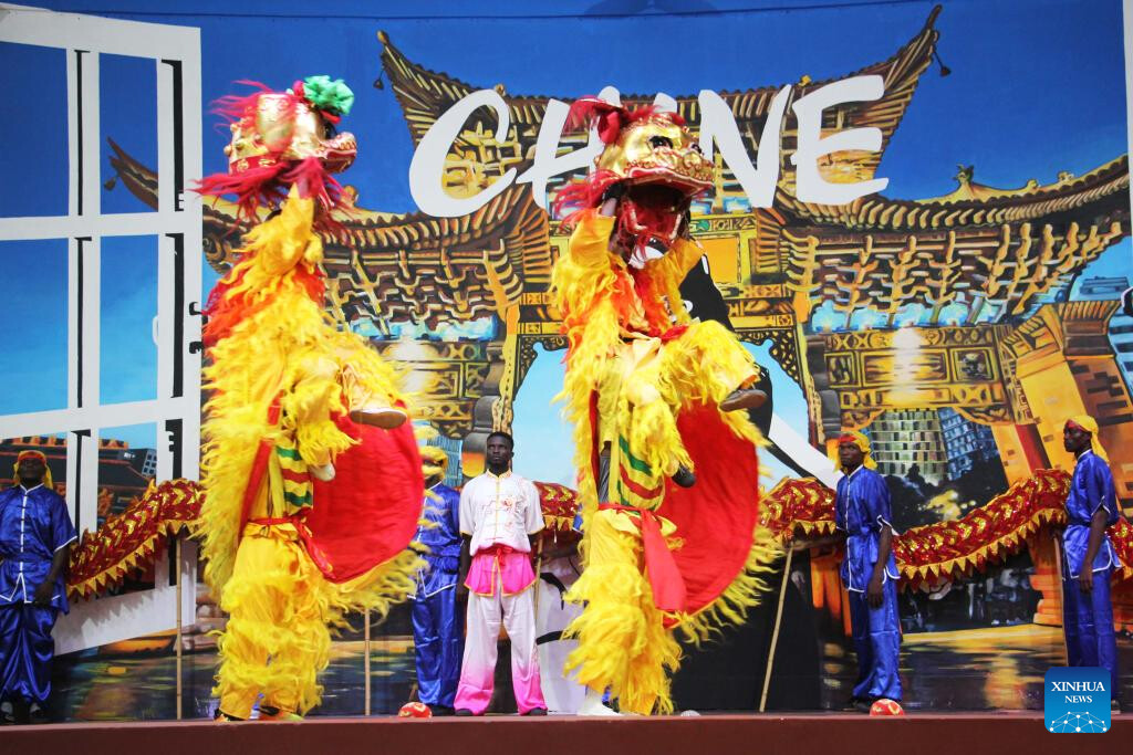 Performers present a lion dance during a Spring Festival gala at the Chinese Cultural Center in Cotonou, Benin, Jan. 25, 2025. The 2025 "Happy Chinese New Year" celebrations kicked off here recently, which will last till Feb. 12. (Photo by Seraphin Zounyekpe/Xinhua)