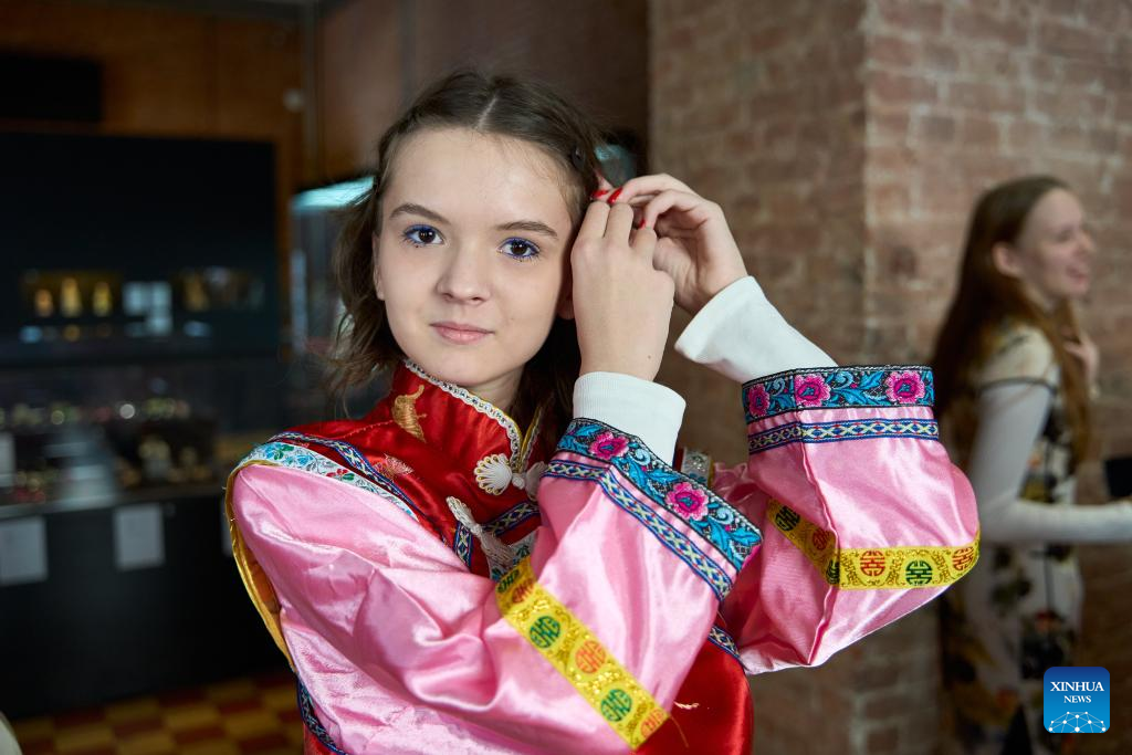 A participant tries on traditional Chinese costume during an event in celebration of the Chinese New Year at the Confucius Institute of Far Eastern Federal University of Russia, in Vladivostok, Russia, Jan. 29, 2025. The Confucius Institute of Far Eastern Federal University of Russia hosted a Chinese New Year cultural experience event, attracting many participants. (Photo by Guo Feizhou/Xinhua)