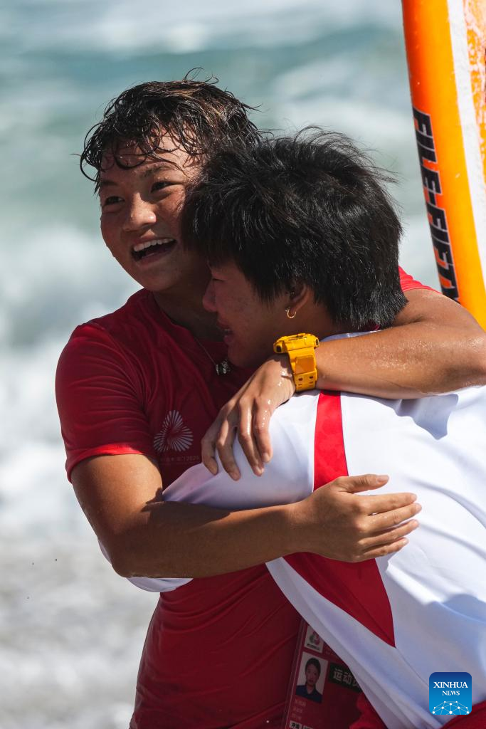 Yang Siqi (L) of Sichuan celebrates with her teammate after winning the women's final of shortboard surfing at China's 15th National Games in Nan'ao, south China's Guangdong Province, Nov. 16, 2025. (Xinhua/Liu Kun)