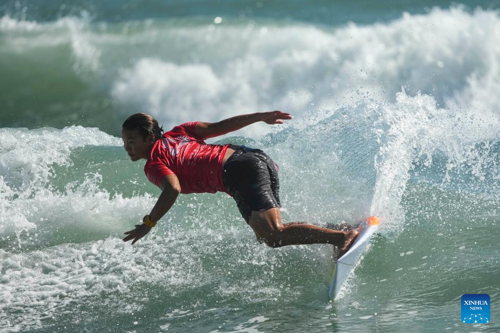 Wu Shidong of Hainan competes during the men's final of shortboard surfing at China's 15th National Games in Nan'ao, south China's Guangdong Province, Nov. 16, 2025. (Xinhua/Liu Kun)