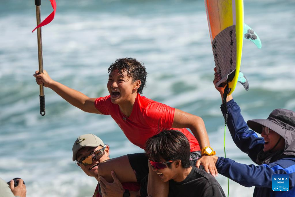 Yang Siqi of Sichuan celebrates after winning the women's final of shortboard surfing at China's 15th National Games in Nan'ao, south China's Guangdong Province, Nov. 16, 2025. (Xinhua/Liu Kun)