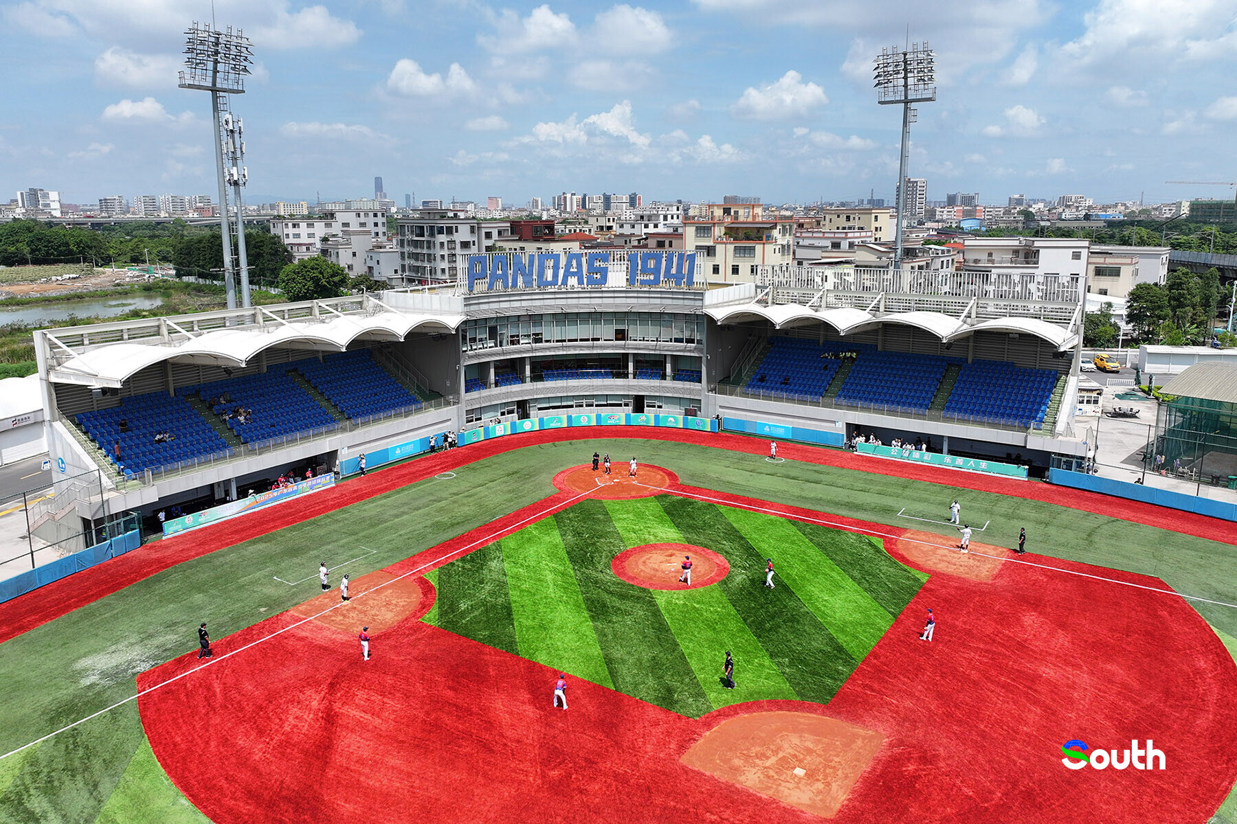 The baseball competition of the 15th National Games is in full swing at the Zhongshan International Baseball and Softball Center. On the field, the giant word "PANDAS" and the number "1941" reflect the city's rich baseball heritage.