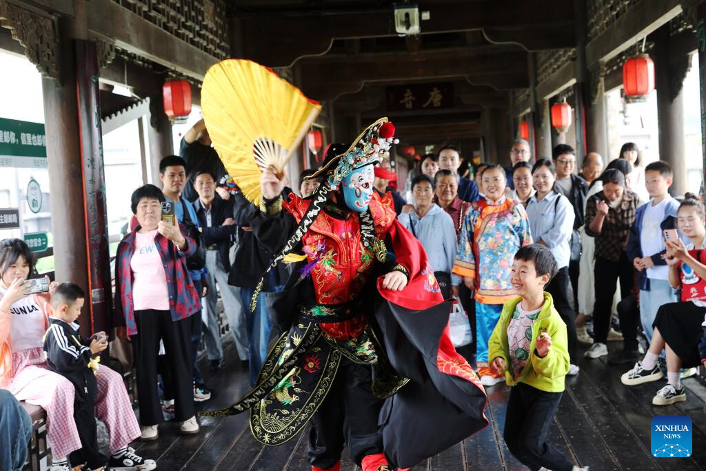 A staff member performs Bianlian, or face-changing, a part of the Sichuan opera, on a covered bridge at the Zhuoshui Ancient Town scenic area in Qianjiang District, southwest China's Chongqing, on May 31, 2025. The Dragon Boat Festival, also known as Duanwu Festival, is a traditional Chinese holiday to commemorate ancient Chinese poet Qu Yuan from the Warring States Period (475-221 B.C.). Celebrated on the fifth day of the fifth month of the Chinese lunar calendar, the festival falls on May 31 this year. (Photo by Yang Min/Xinhua)