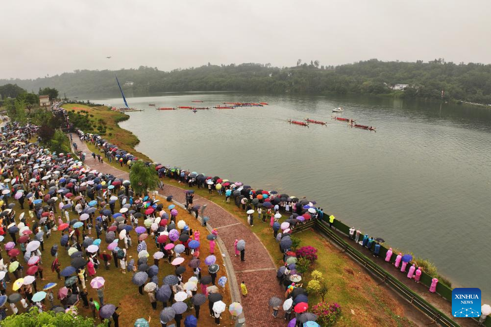 Teams compete in a dragon boat race on the Jinjiang River in Bijiang District of Tongren city, southwest China's Guizhou Province, on May 31, 2025. The Dragon Boat Festival, also known as Duanwu Festival, is a traditional Chinese holiday to commemorate ancient Chinese poet Qu Yuan from the Warring States Period (475-221 B.C.). Celebrated on the fifth day of the fifth month of the Chinese lunar calendar, the festival falls on May 31 this year. (Xinhua/Yang Wenbin)