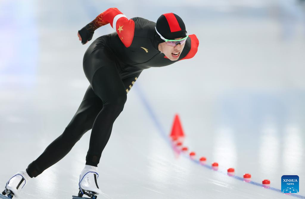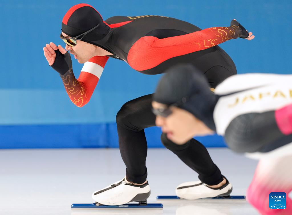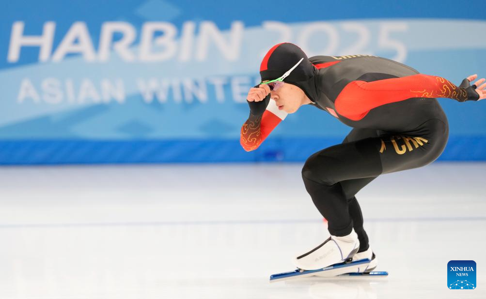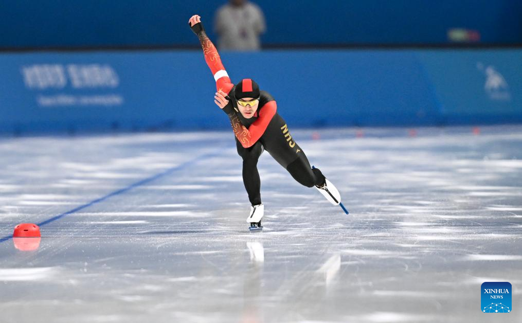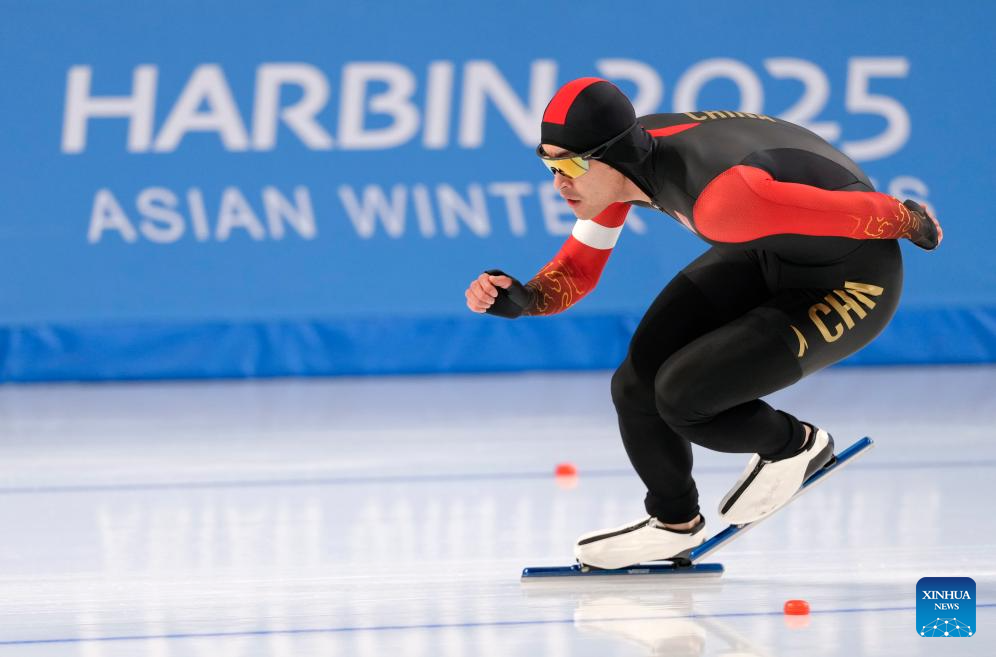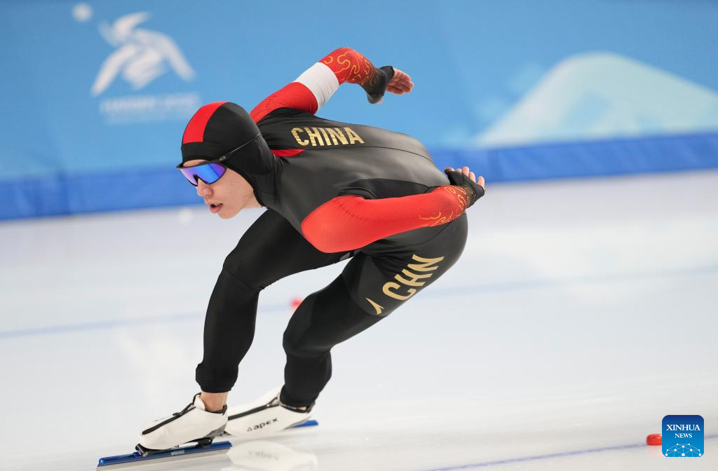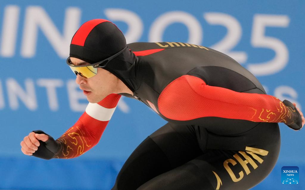 Lian Ziwen of China competes during the men's 1000m final match of the speed skating event at the 9th Asian Winter Games in Harbin, northeast China's Heilongjiang Province, Feb. 11, 2025. (Xinhua/Chen Zhenhai)