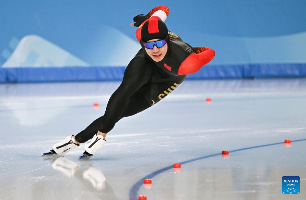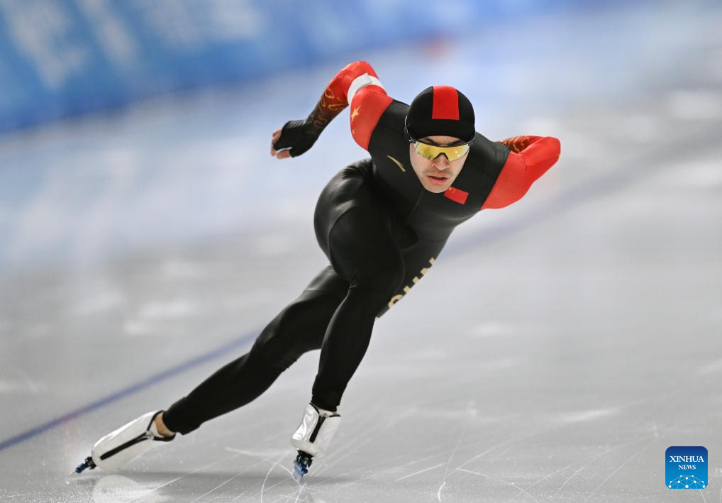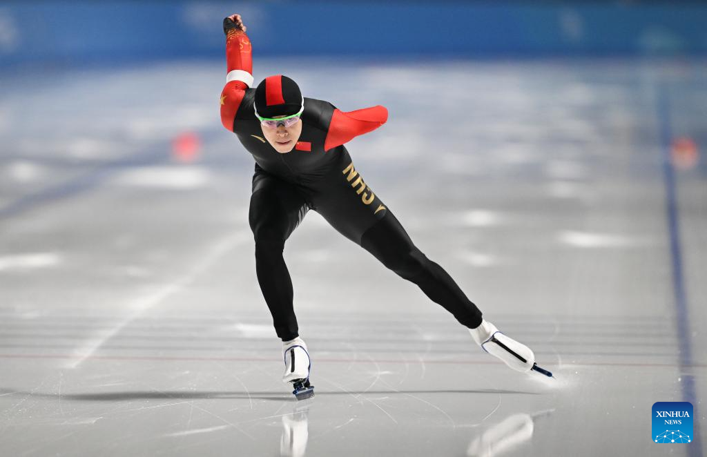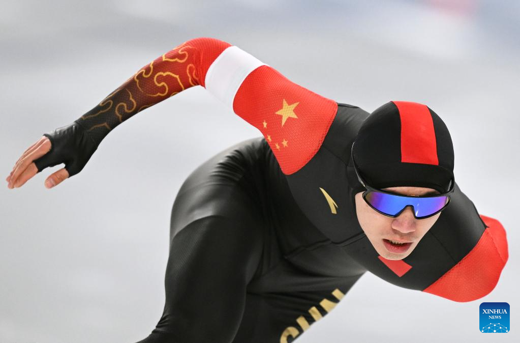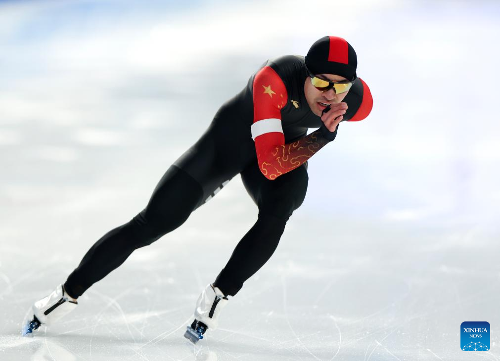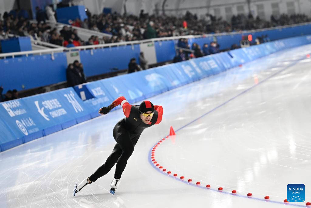 Lian Ziwen of China competes during the men's 1000m final match of the speed skating event at the 9th Asian Winter Games in Harbin, northeast China's Heilongjiang Province, Feb. 11, 2025. (Xinhua/Chen Zhenhai)