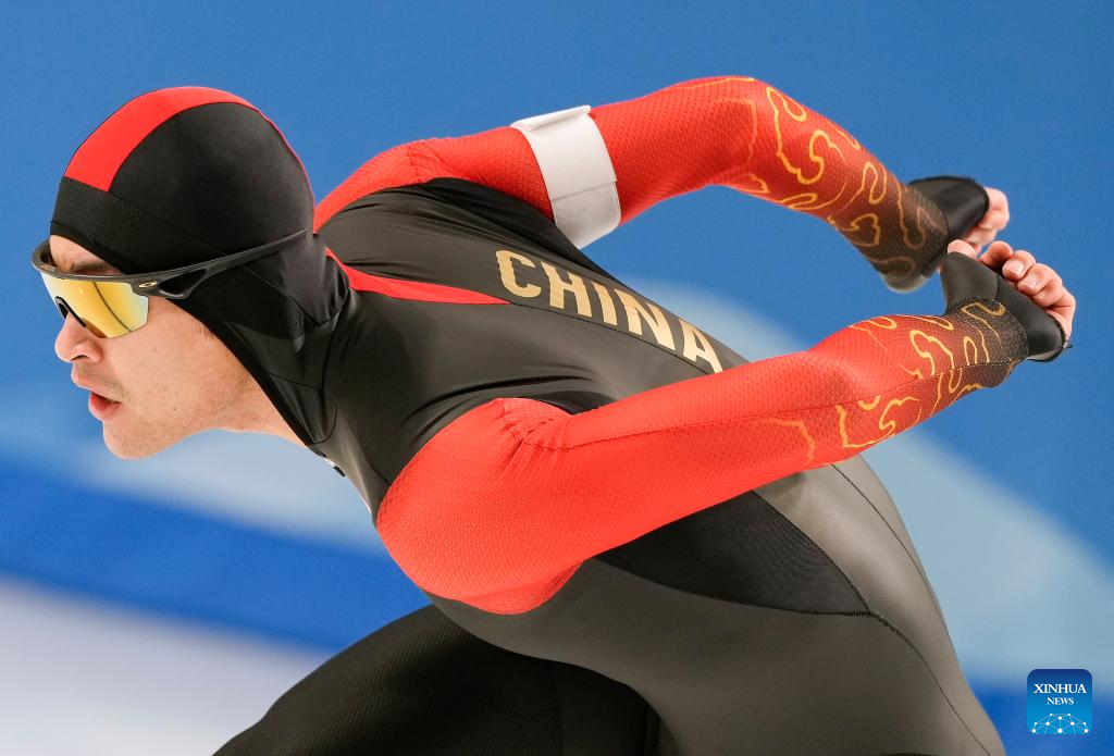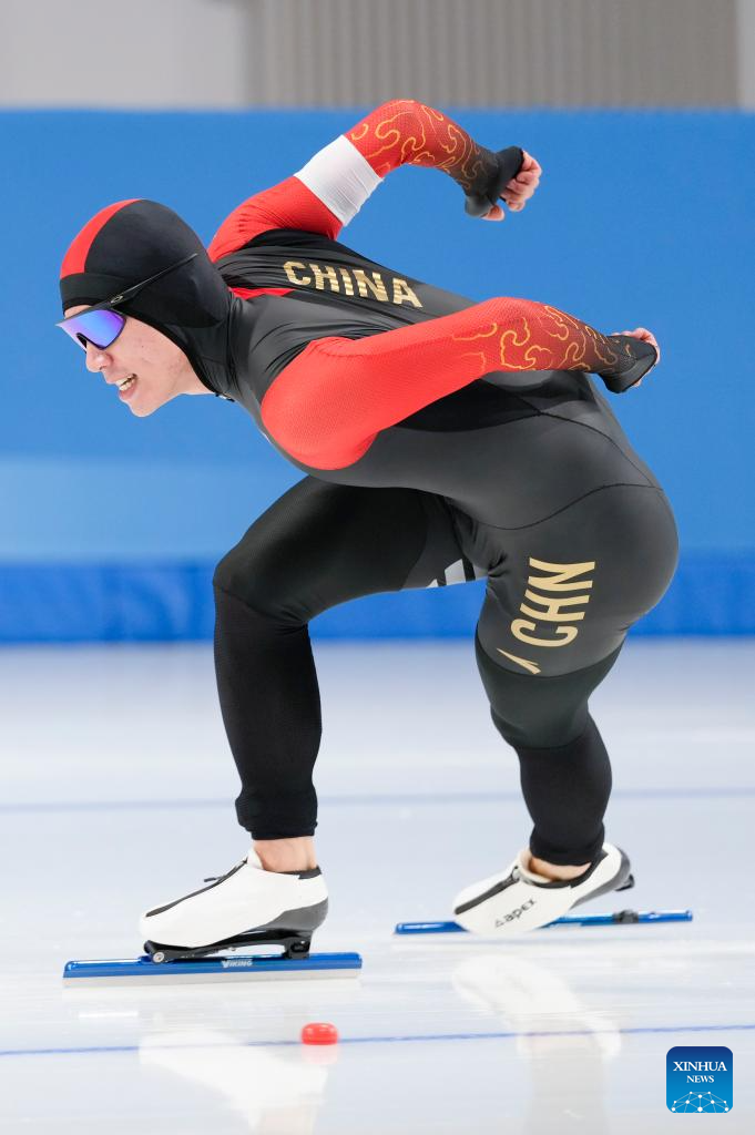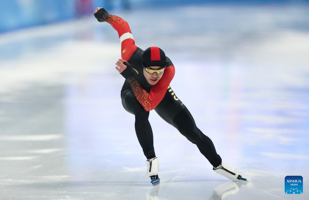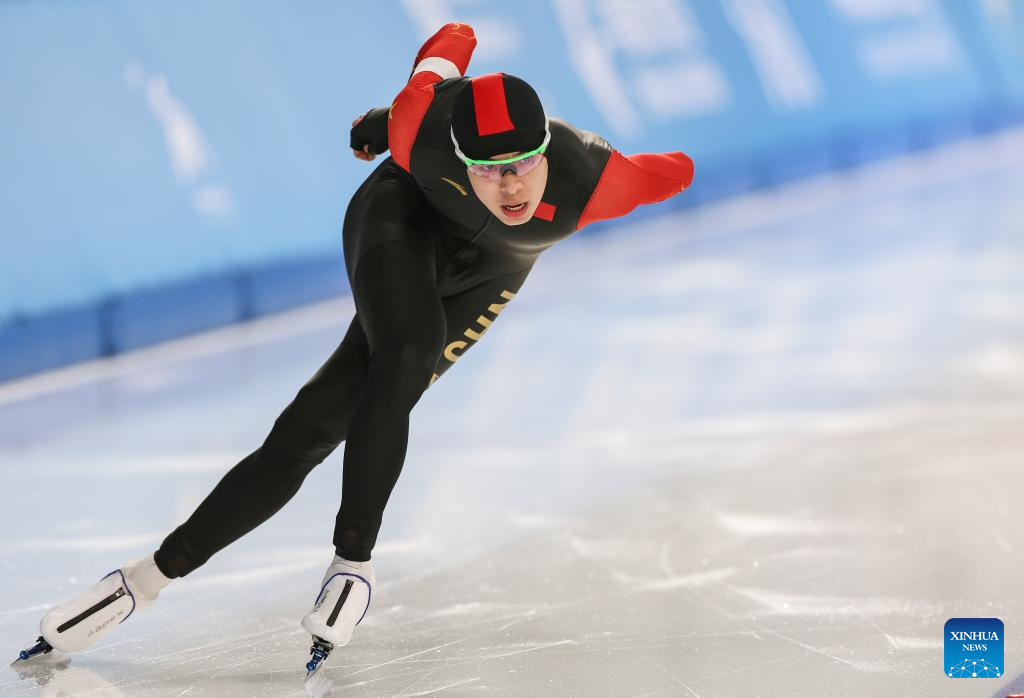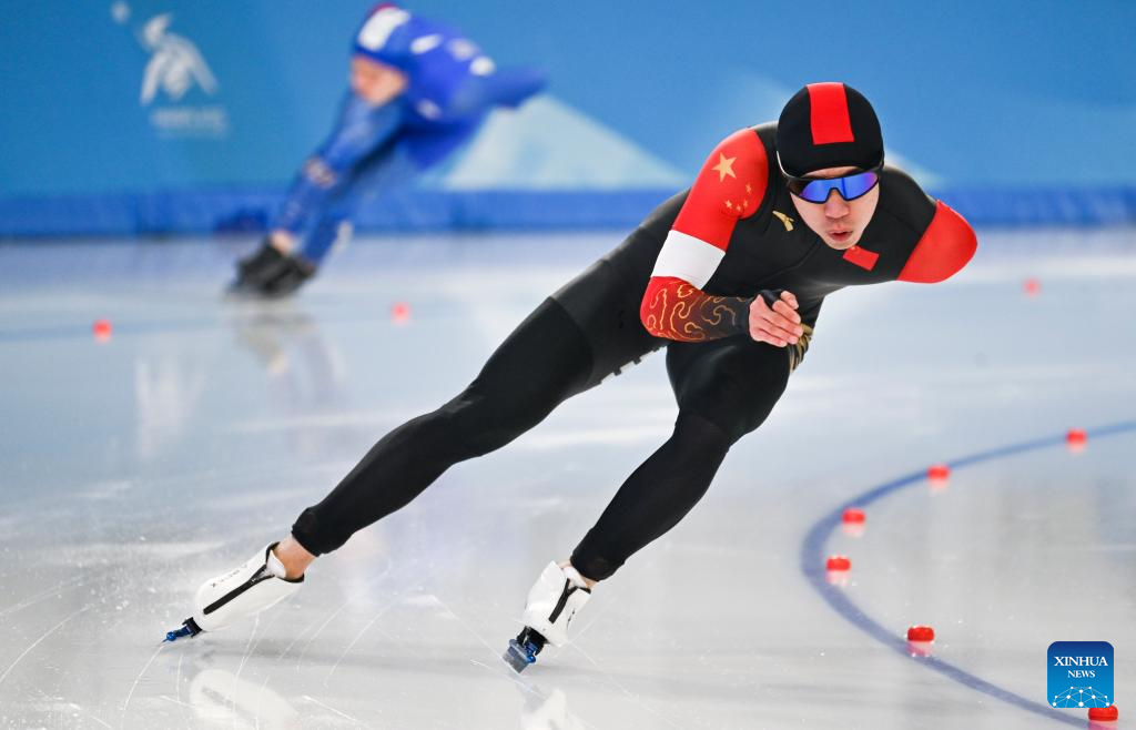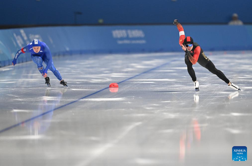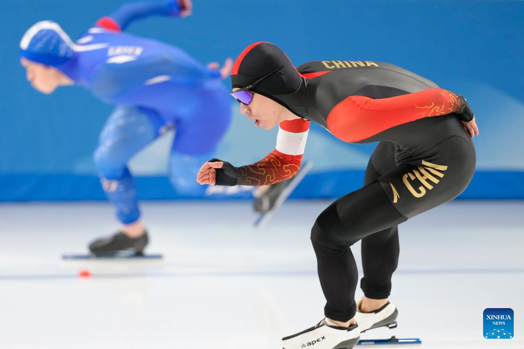 Lian Ziwen of China competes during the men's 1000m final match of the speed skating event at the 9th Asian Winter Games in Harbin, northeast China's Heilongjiang Province, Feb. 11, 2025. (Xinhua/Chen Zhenhai)