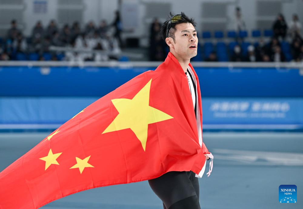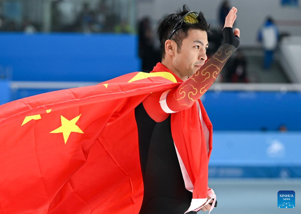 Ning Zhongyan of China celebrates after the men's 1000m final match of the speed skating event at the 9th Asian Winter Games in Harbin, northeast China's Heilongjiang Province, Feb. 11, 2025. (Xinhua/Wang Kaiyan)
