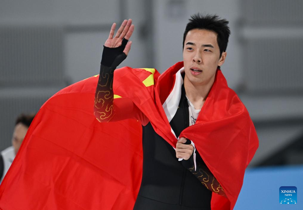 Lian Ziwen of China celebrates after the men's 1000m final match of the speed skating event at the 9th Asian Winter Games in Harbin, northeast China's Heilongjiang Province, Feb. 11, 2025. (Xinhua/Wang Xi)