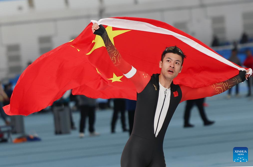 Ning Zhongyan of China celebrates during the men's 1000m final match of the speed skating event at the 9th Asian Winter Games in Harbin, northeast China's Heilongjiang Province, Feb. 11, 2025. (Xinhua/Chen Zhenhai)
