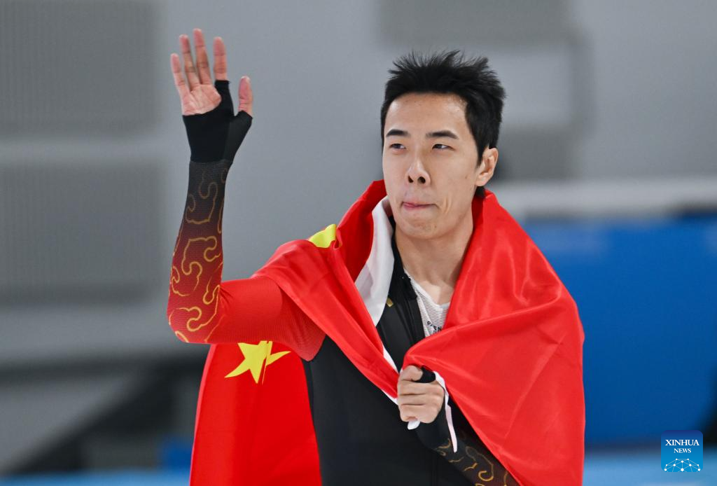Ning Zhongyan of China reacts during the men's 1000m final match of the speed skating event at the 9th Asian Winter Games in Harbin, northeast China's Heilongjiang Province, Feb. 11, 2025. (Xinhua/Chen Zhenhai)