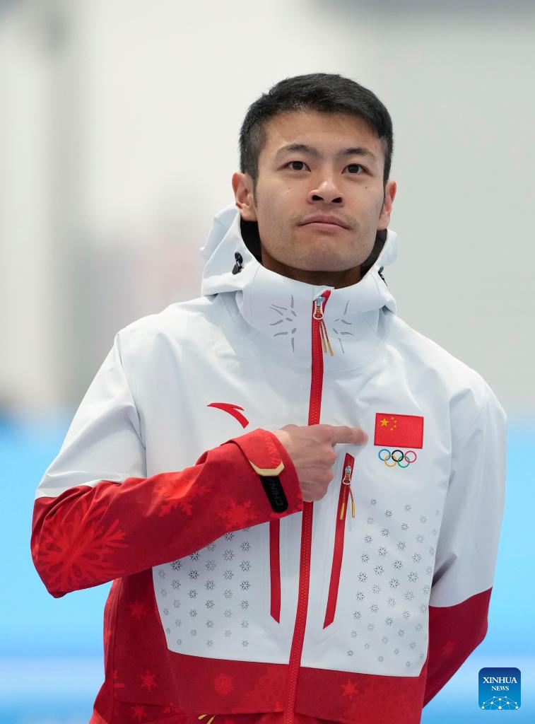 Ning Zhongyan of China celebrates during the awarding ceremony of the men's 1000m final match of the speed skating event at the 9th Asian Winter Games in Harbin, northeast China's Heilongjiang Province, Feb. 11, 2025. (Xinhua/Wang Jianwei)