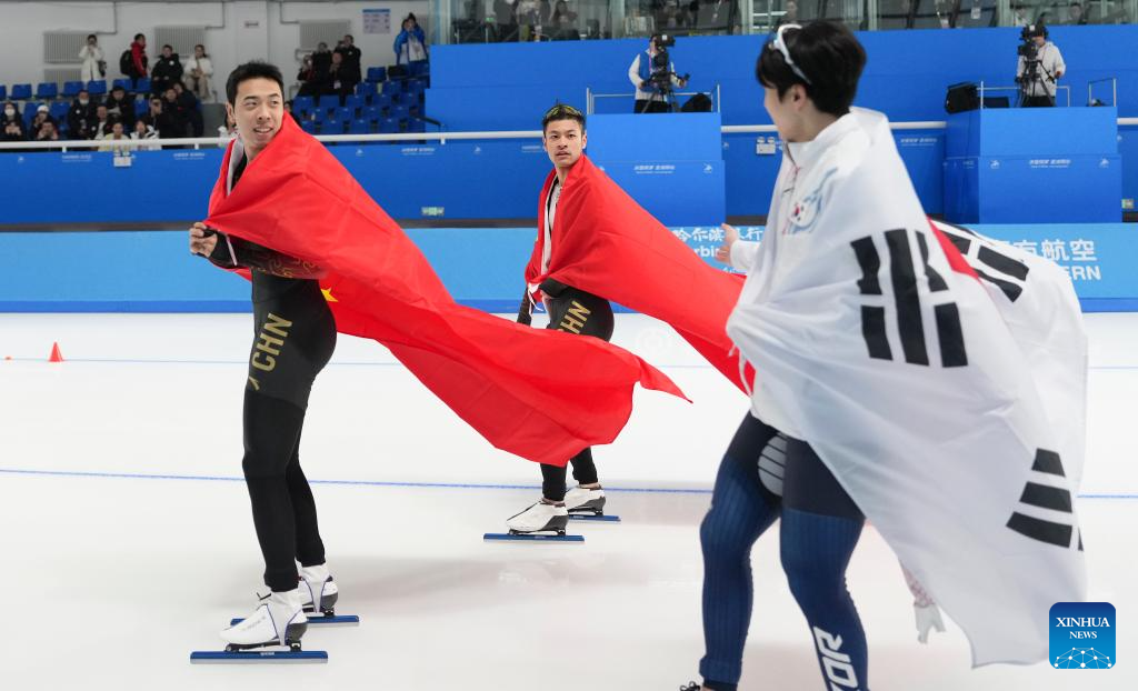 Cha Min Kyu (R) of South Korea and Lian Ziwen (L, front) of China celebrate after the men's 1000m final match of the speed skating event at the 9th Asian Winter Games in Harbin, northeast China's Heilongjiang Province, Feb. 11, 2025. (Xinhua/Chen Zhenhai)