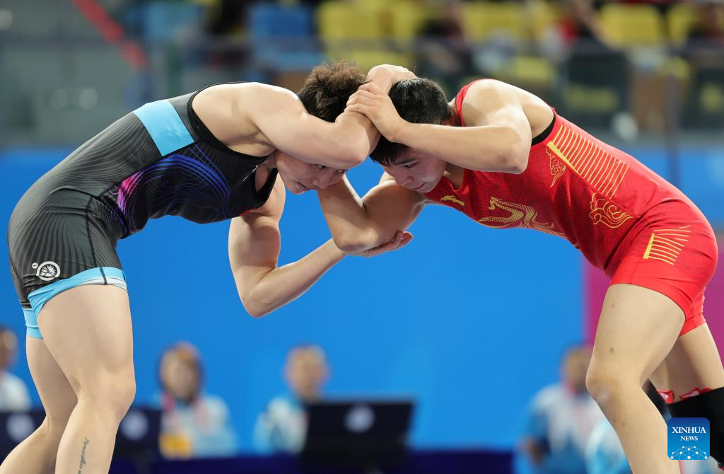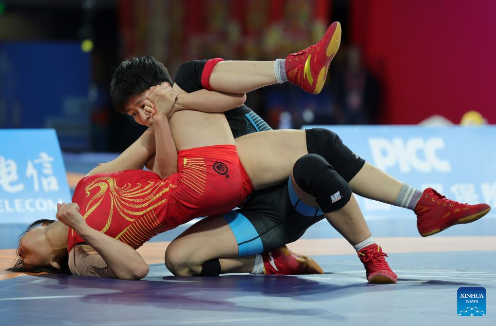 Zhang Jin (L) of Jiangsu competes against Pang Qianyu of Hunan during the women's freestyle 53kg final match of wrestling at China's 15th National Games in Qingyuan, south China's Guangdong Province, Nov. 10, 2025. (Xinhua/Li Ran)