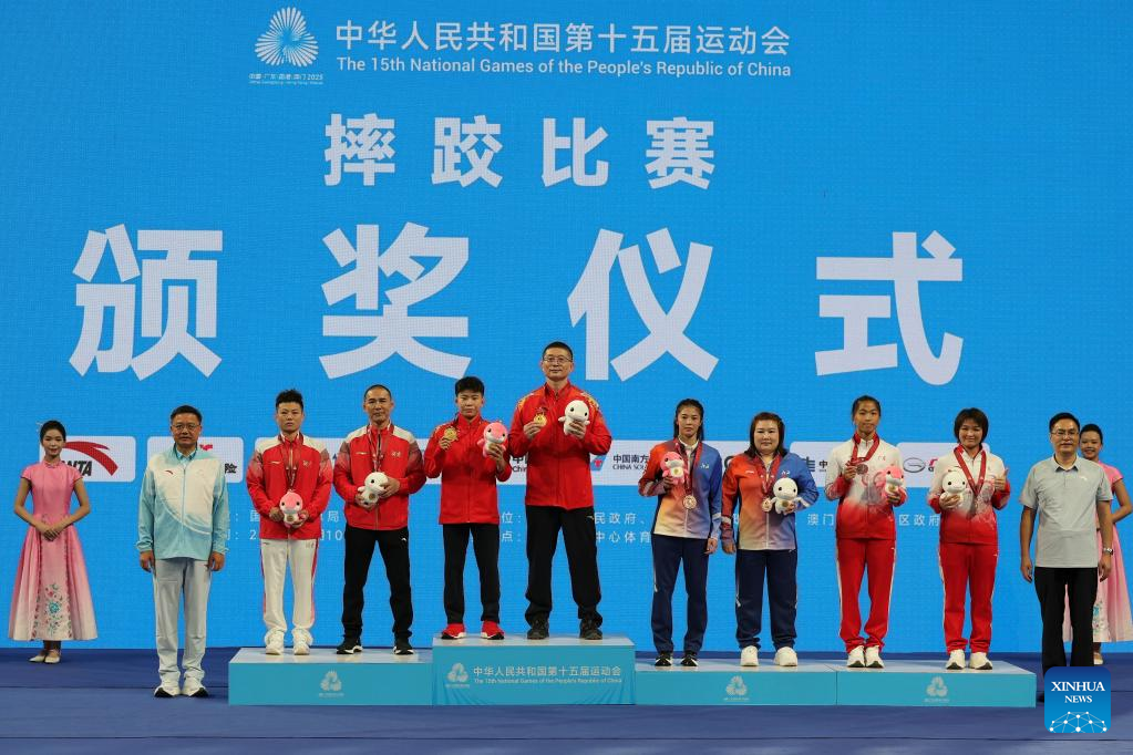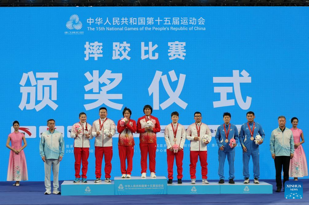 Gold medalist Zhang Qi of Jilin, silver medalist Bao Lingling of Inner Mongolia, bronze medalist Li Li of Inner Mongolia pose for group photos with their coaches during the awarding ceremony for the women's freestyle 62kg of wrestling at China's 15th National Games in Qingyuan, south China's Guangdong Province, Nov. 10, 2025. (Xinhua/Li Ran)