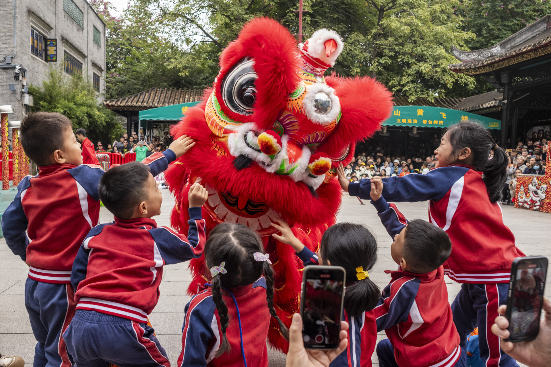 School kids touch the lion head for good luck in Foshan Ancestral Temple, Foshan, Guangdong, Friday, November 22, 2024. (Ringo Chiu)